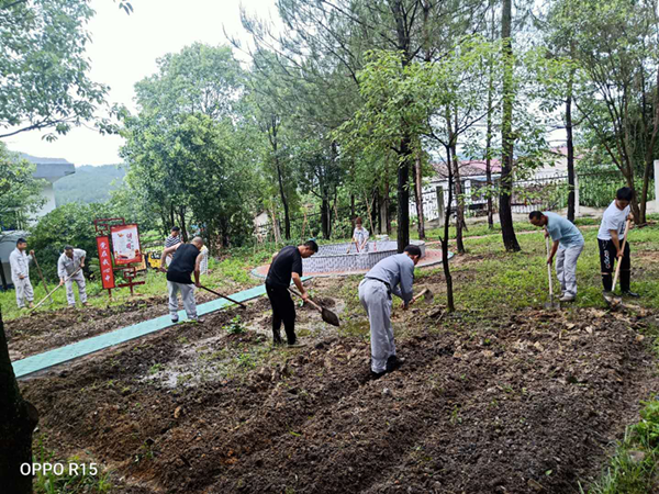 今天的任务十分“艰巨”,要将生活区后院改造成菜园。大家热情高涨,自发地分成多个小组垦荒,前面拿铁锹的刚翻完地,后面紧接用锄头镐出田垄,现场一派热火朝天的景象,忙而不乱,秩序井然。