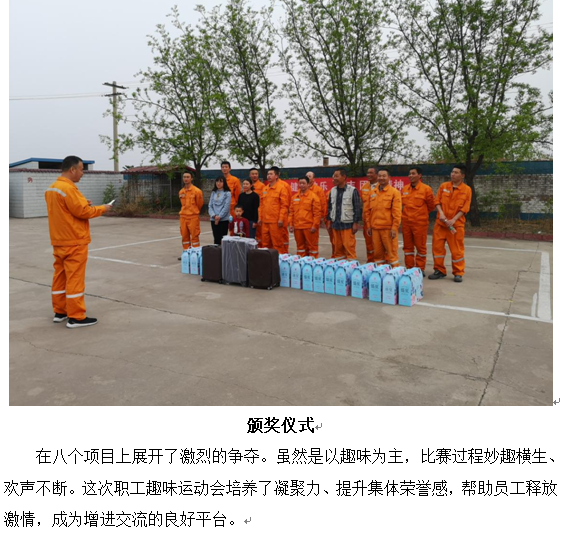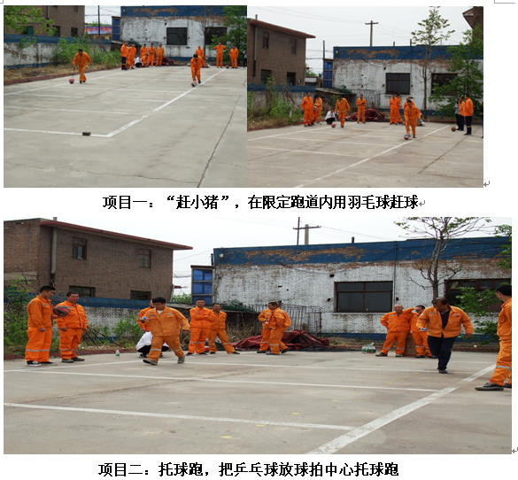 为进一步增强职工们的身体素质,丰富文体生活,增强凝聚力,在“五四”青年节来临之际兖州文水分公司、吕梁分公司、中材文水分公司精心筹备,周密策划的职工趣味运动会,在兖州文水分公司生活区如期举行。本次运动会的主题是“以促进友谊为主,贵在人人参与,活跃公司气氛”。以青年员工为主20多名干部职工参加了本次运动会。通过自娱自乐这种形式,增强团队合作精神,培养职工热爱运动,促进身体健康,增强公司凝聚力、战斗力、号召力的目的。5月6日下午,三个分公司的职工趣味运动会,在经理王建立宣读比赛规则后拉开了帷幕。此次活动由办公室人员组织策划,得到公司大力支持与全体员工的积极配合和参与。本次运动会共设有八个比赛项目:
