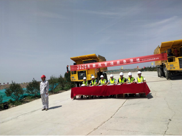 此次演练模拟的情景是:现场人员发现观景平台东侧因大雨导致山水顺坡而下,汇于东侧大水罐交汇处急流于南、北凹陷采场,山水携带的杂物将南侧道路排水沟堵塞,山水汇聚出现险情。