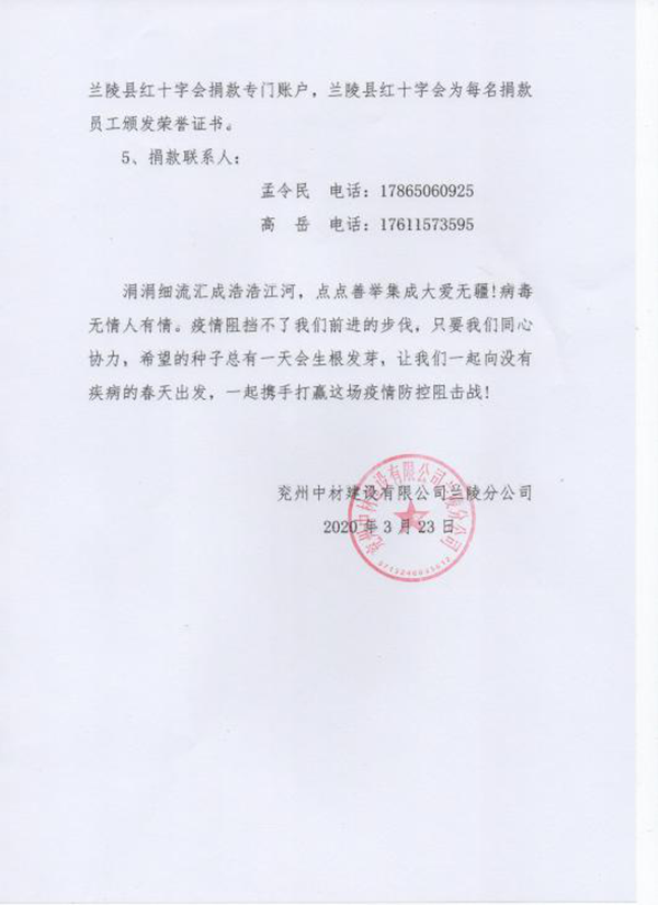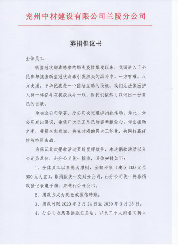 兰陵分公司下发了《募捐倡议书》,坚持自觉自愿与量力而行的原则,呼吁全体员工积极参与,奉献爱心,捐款助力抗击疫情。分公司经理龚士朋同志带头捐款,以实际行动做表率,起到很好的模范作用。在龚经理的带动下,分公司全体员工积极响应,纷纷捐款,每一名员工都献出一份爱心。