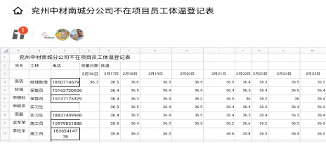 分公司建立多种检查制度,通过现场人员现场检查、在项目隔离人员与未返工员工自查等多种形式进行人员健康状况监测,并如实记录,如有异常者及时送医就诊,做到“早发现,早隔离,早上报,早治疗”,切断传播途径,杜绝疫情蔓延。