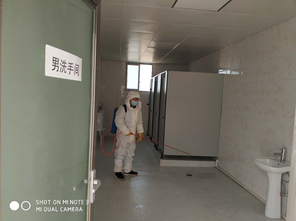 分公司组织专人每日对生活区办公室、餐厅、卫生间等场所每日消毒两次,要求员工做好自我防护,勤消毒勤洗手,共同打造抗击疫情的良好环境。