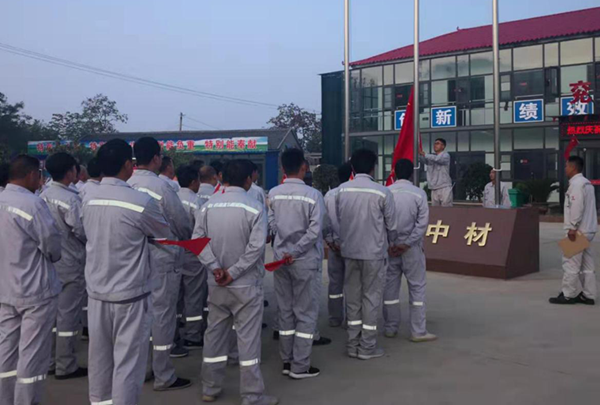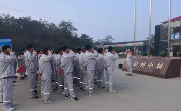 “全体肃立,行注目礼,升国旗,奏唱国歌!”伴随着嘹亮的国歌,五星红旗冉冉升起,兖州中材兰陵分公司全体人员,庄严肃静,目光随着红旗升高。旗升至顶,全体人员注目礼毕,高呼“我爱你中国,祖国万岁”。