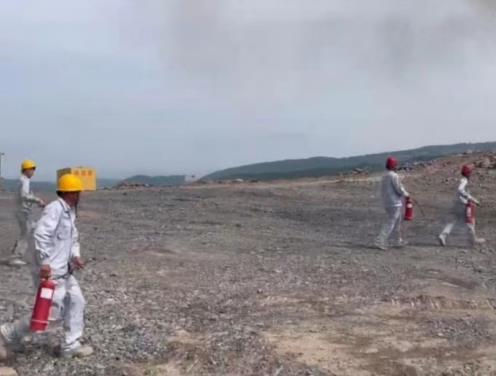 此次演练,灾情设定挖掘机在进行焊接作业时,焊接火花飞溅引燃一旁维修时使用的擦拭油料的棉纱,由于维修位置靠近清表时砍伐的树木且临近矿区边缘林区,由于当天风势较大待发现时被砍伐的树木已被引燃且火势汹涌,发现火灾事故的员工立即通知带班领导。带班领导接到报告后,立即启动应急预案,组织人员进行灭火。