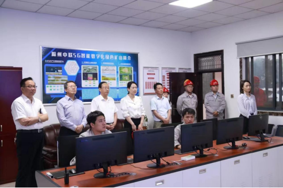 隋同波一行首先参观了矿山5G智能控制室,并认真听取了关于5G智能数字化绿色矿山建设情况汇报。
