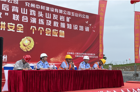 为深入宣贯党的二十大精神和习近平总书记关于安全生产重要论述,进一步树牢“以人为本、安全发展”的安全生产管理理念,贯彻“安全第一、预防为主、综合治理”的安全生产方针,强化非煤矿山事故应急救援管理工作和应急救援队伍建设,切实提高分公司应对矿山突发事故的联合应急救援综合能力,6月17日,兖州中材玉山分公司联合江西玉山万年青水泥有限公司、玉山县蓝天救援队、玉山县人民医院等举办2023年“物体打击事故”联合演练及救援知识培训活动。玉山县应急管理局局长吴高峰、玉山万年青水泥有限公司总经理李跃华等出席本次活动并致辞。
