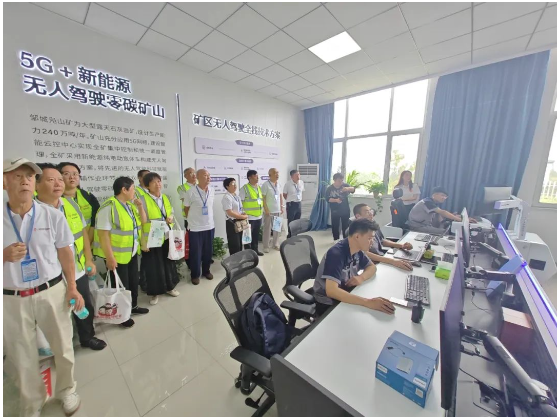 启动仪式后,全体人员走进兖州中材邹城分公司,亲身感受兖州中材近年来的发展变化。在讲解员的带领下,全体人员依次参观办公楼无人驾驶云控中心、骨料生产线中控室、矿山180观景平台观摩无人驾驶运输,近距离了解兖州中材在生态环保、绿色发展、矿山开采、智能制造等方面取得的成绩。