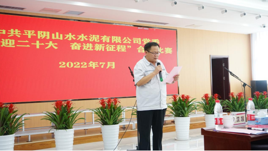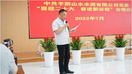 15:50分活动正式开始,平阴山水党委书记侯福存发表主旨讲话:今年是建党101周年。100多年来,我党团结带领全国各族人民自强不息、拼搏进取,战胜艰难险阻,取得了举世瞩目的辉煌成就,带领我们昂首阔步迈向伟大复兴。今天,我们隆重集会,用歌声颂扬党的光辉历史,缅怀党的丰功伟绩,向党的101岁华诞献礼,向党的二十大献礼。公司党委举办本次合唱大赛,既是丰富党建工作形式、促进党建和公司中心工作高度融合的重要举措,也希望通过比赛,进一步增强党群、干群凝聚力和向心力,激励全体干部职工坚定信念、迎难而上,在“百日赶超”劳动竞赛中继续立足岗位、攻坚克难,全力冲刺“大赶超”任务目标,为公司项目建设和高质量发展贡献更大力量。